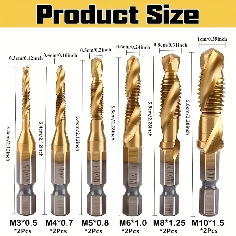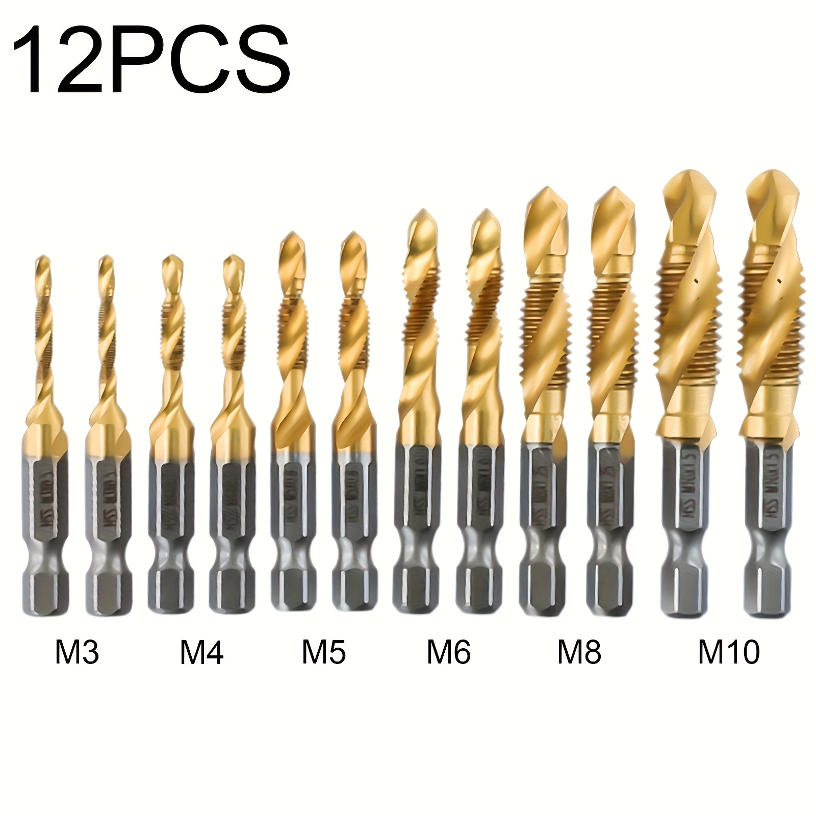 12 komada set HSS 3-u-1 burgija sa titanijumskim premazom, M3-M10 navoj, konusni i navojni nastavci – brzorezni čelik metrički set alata za DIY, vodoinstalaterske radove, automobilsku industriju (za spiralno narezivanje)