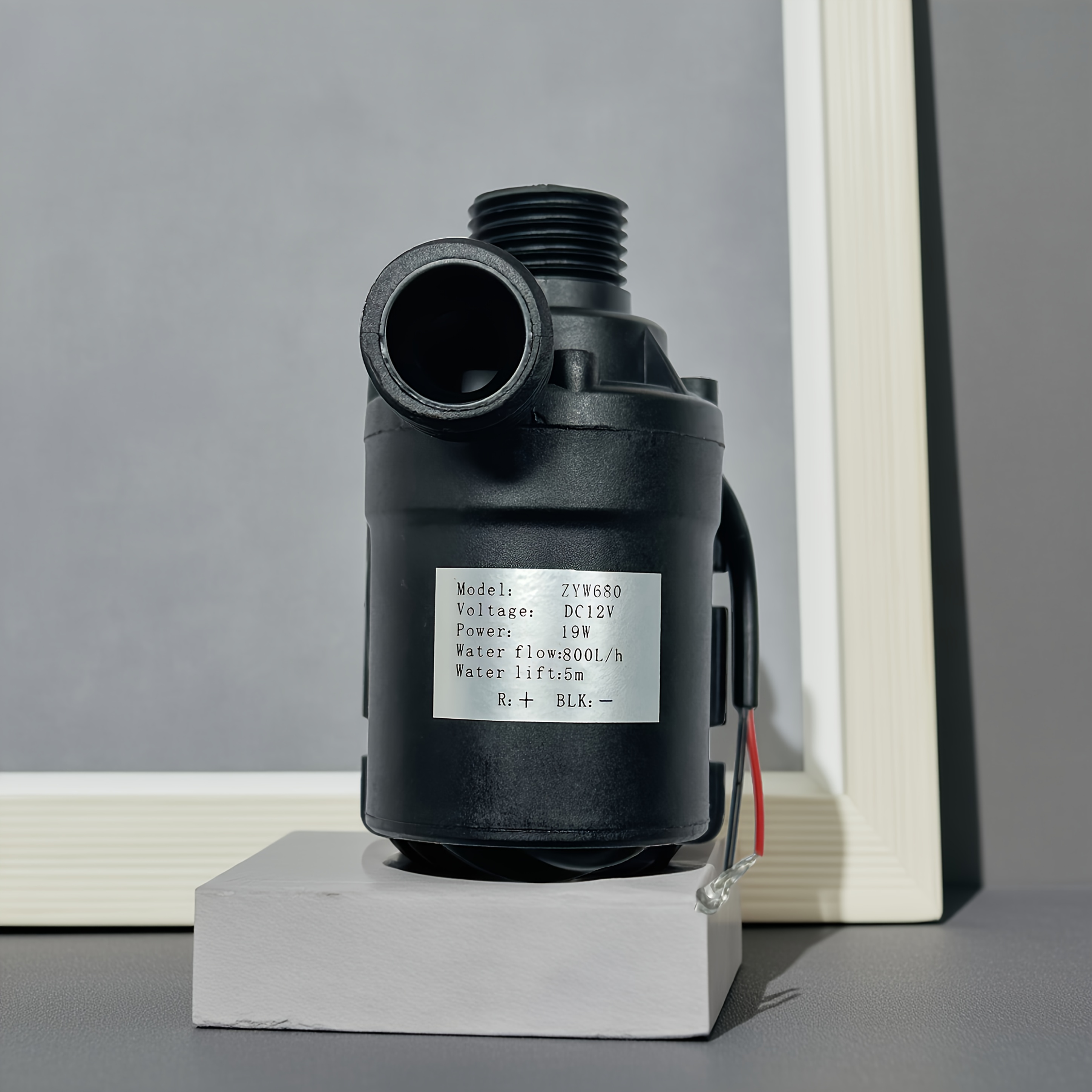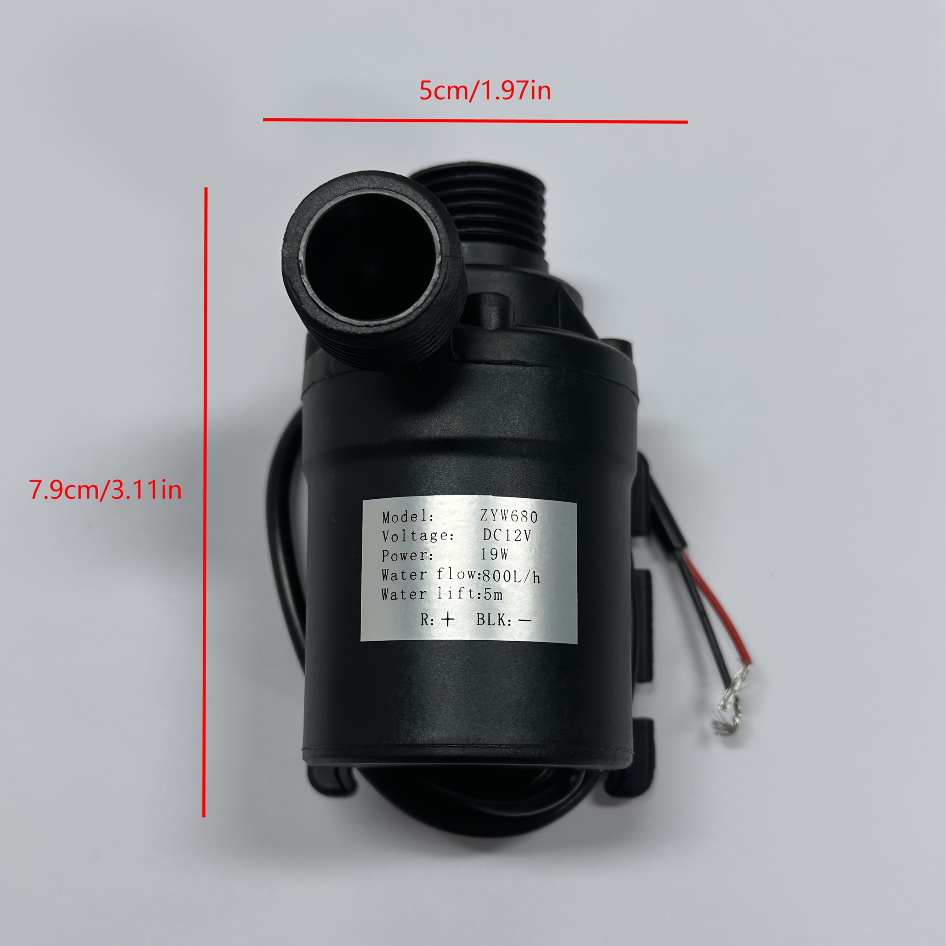 Pregled proizvoda Specifikacije: Materijal: ABS Potrošnja energije: 19 wata Radni napon: 12VDC Nazivna struja: 1.5A Maksimalna protok brzina: 800 litara po sati (210 galona po satu) Maksimalna visina podizanja: 4 metra (13 stopa) Prečnik ulaza: 0.5 inča Prečnik izlaza: 0.5 inča Nivo buke: manje od 35dB Vodootpornost: IP68 Vek trajanja: preko 30.000 sati Radna temperatura: 0℃ – 60℃/(32°F – 140°F) Veličina artikla: 77*66*49mm Težina: 220 grama (7.8 unci) Dužina kablova za napajanje: 46cm (18 inča)