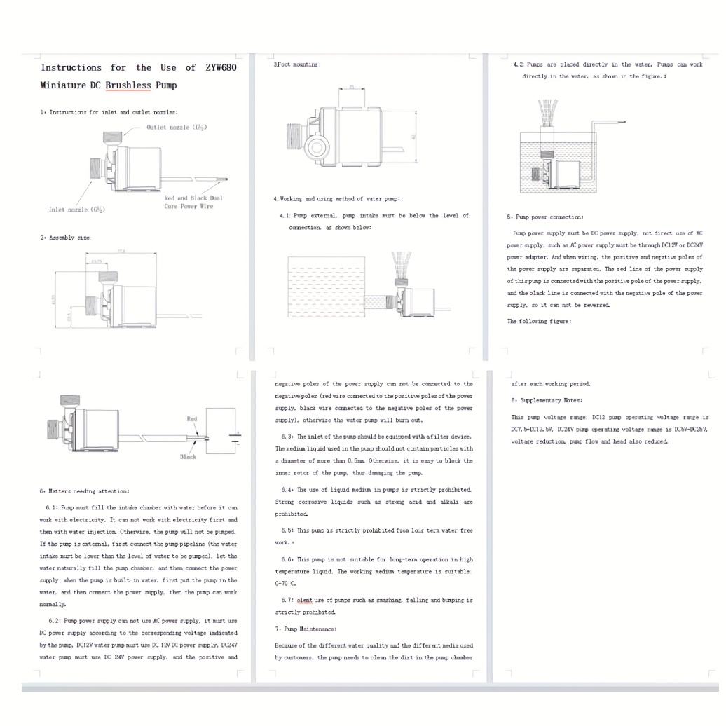 Važne tačke: 1. Operišite na navedenoj naponi (DC12V/1.5A). Crvena žica označava pozitivni terminal, dok je crna žica za negativni terminal. Visoki napon i struja mogu smanjiti vek trajanja pumpe. 2. je centrifugalna pumpa i ne može da se samostalno odstrani vazduh; mora da se instalira pod vodom. 3. Uverite se da nisu česti čestičići u pumpi. 4. Ne koristite pumpu tokom dugotrajnog vremena ako je brana.