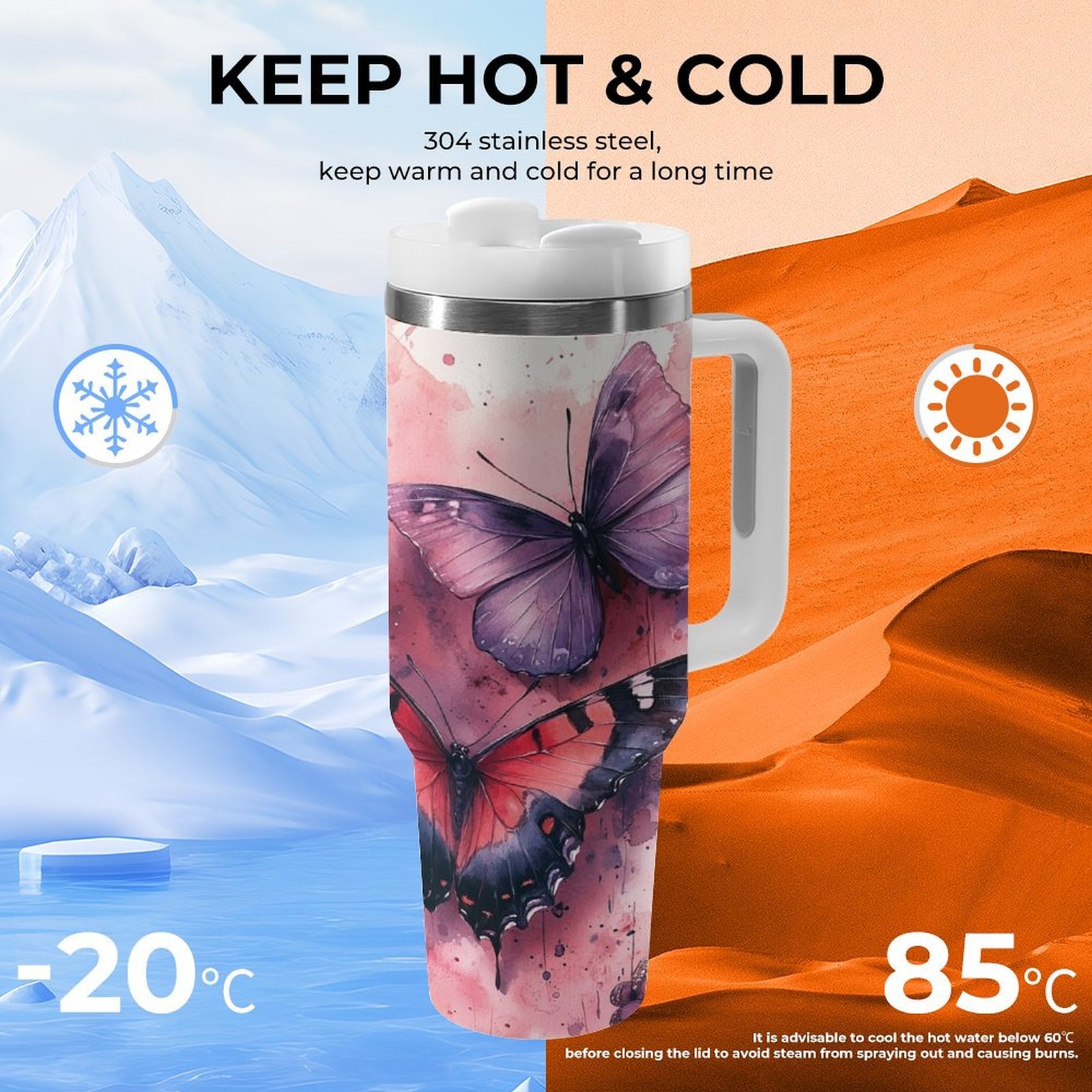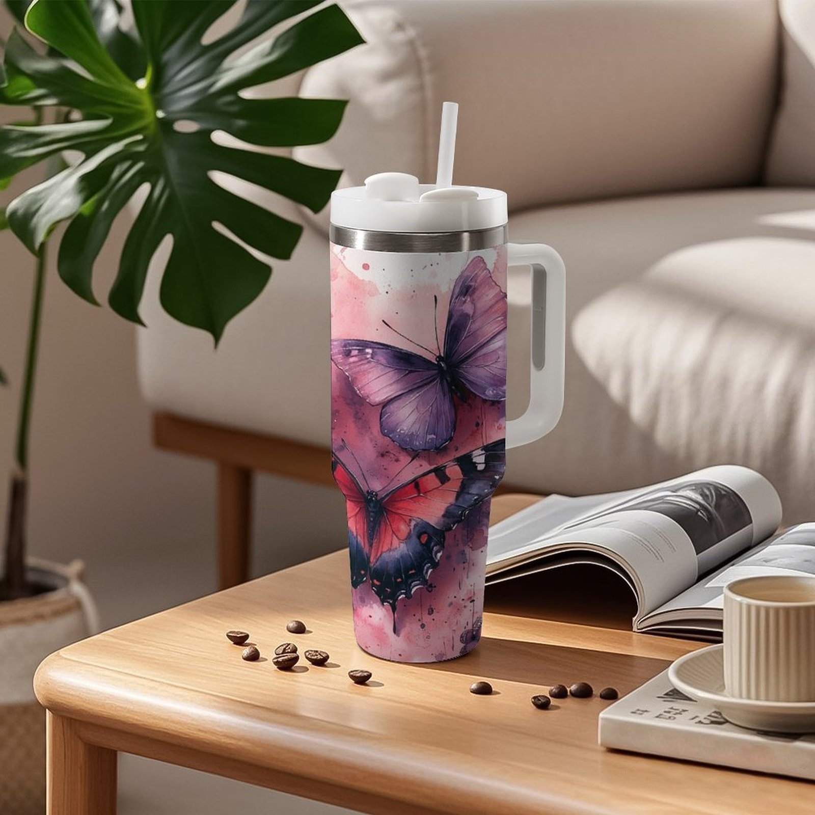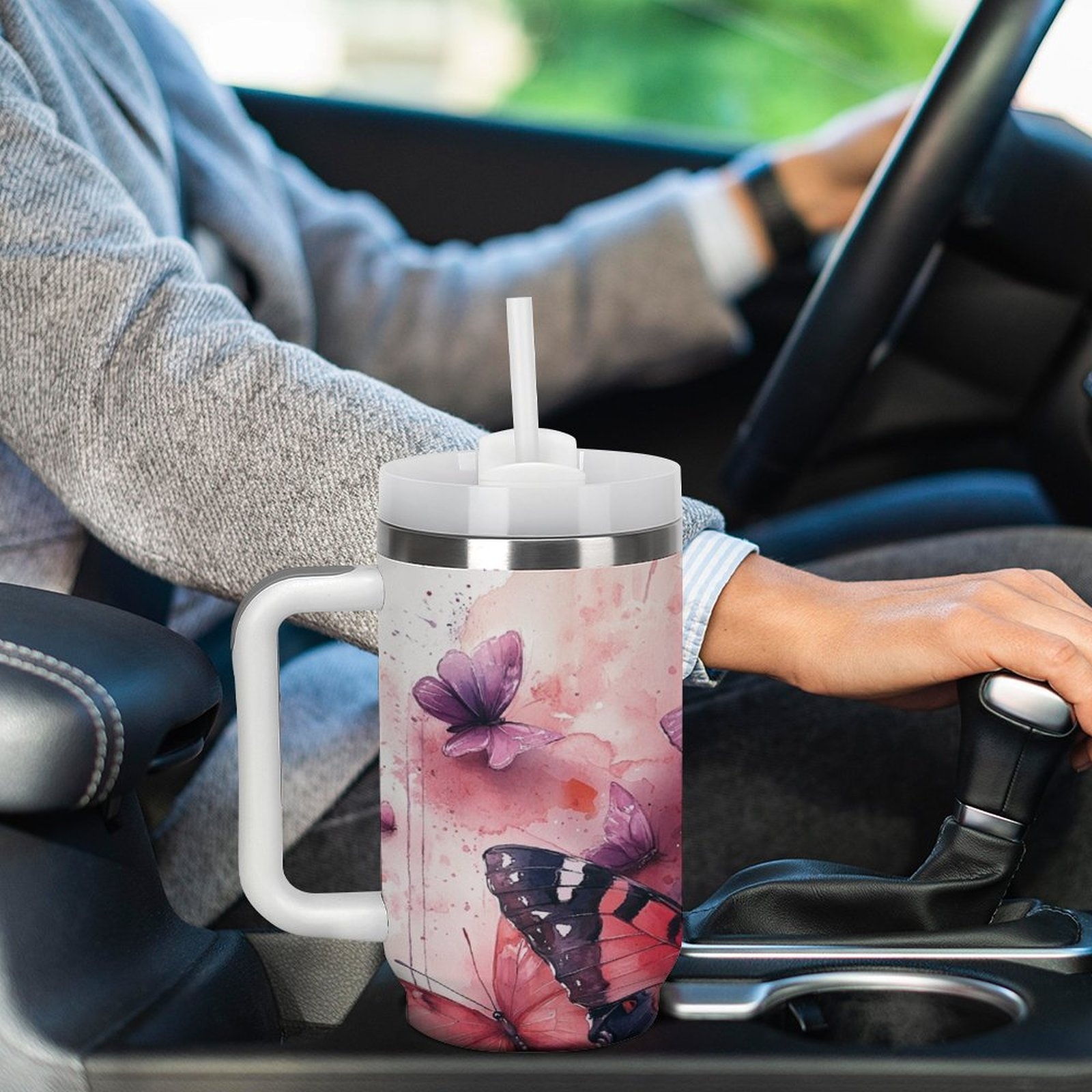 Jedan veliki 40oz čaša od nerđajućeg čelika sa slamkom i ručkom – dvostrana vakuumski izolovana čaša, nepropusna poklopac, elegantan dizajn sa leptirom i cvetom u roze/crvenoj/crnoj/beloj/sivoj – za kafu, čaj, teretanu, putovanje, kancelariju, kampovanje – idealan poklon za žene i muškarce, kancelarijski pribor, umetnički pribor, izdržljiva konstrukcija, višekratna čaša, entuzijasti za fitnes, prozirna čaša sa delfinom, čaša sa promenljivom bojom sa slamkom, putna čaša za kafu, Stanly čaša