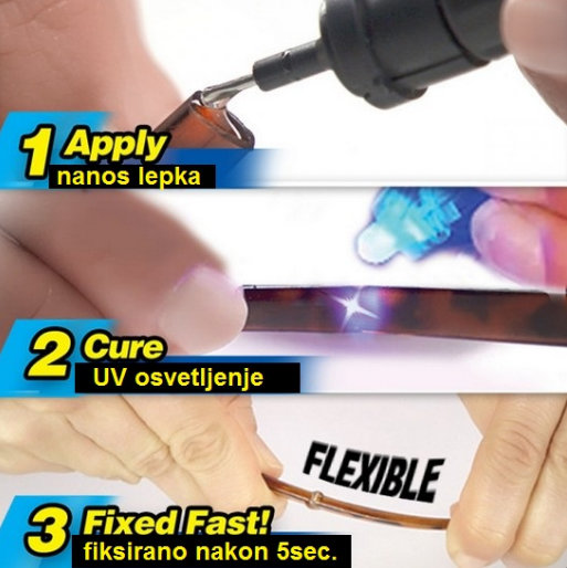 Jednostavno nanesite lepilo 5 Second Fix, a zatim aktivirati UV svetlo za trajnu, vezu u 3 sekunde