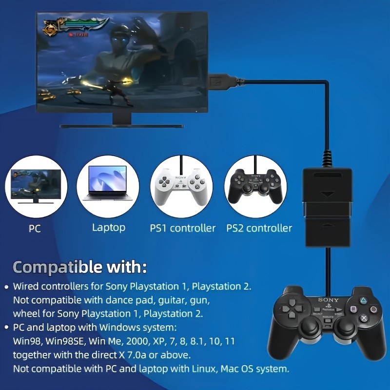 Kompatibilnost sa kontrolerima za Sony Playstation 1, PSX i Playstation 2 do PS3/PC kontrolera. Podržava Win98, Win98SE, Win Me, Win2000 i novo najavljeno Win XP, Win 7 zajedno sa direktnim X 7.0a ili novijom verzijom