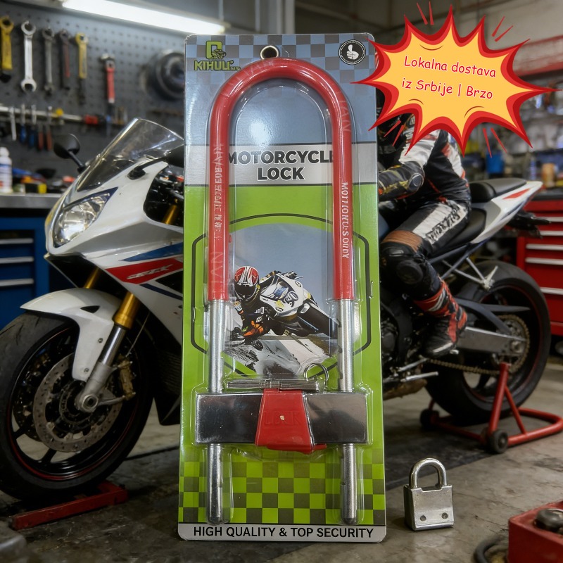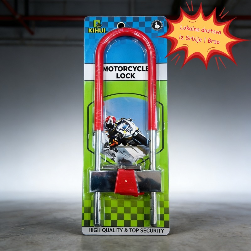 Biciklistička brava u obliku slova U, protivprovalna brava za motocikle i električne skutere, lokalna dostava u Srbiji, ima dvostruke mehanizme zaključavanja otporne na sečenje i okidanje