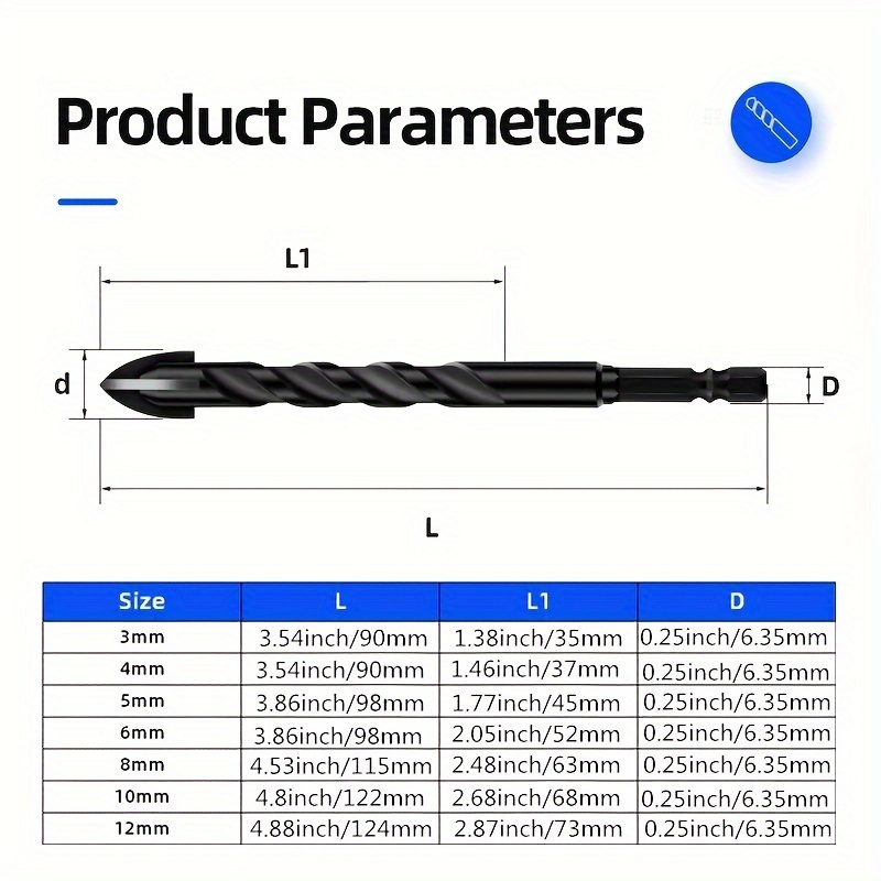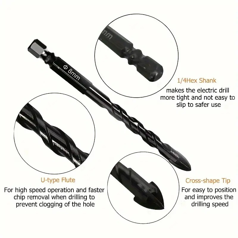 Ovaj proizvod je napravljen od legure i ima titanijumski sloj. On je dizajniran za upotrebu na pločicama i staklu, dostupan u veličinama od 3mm do 12mm. Nje karakteristike uključuju izvanrednu čvrstoću i trajnost, minimalno otpornost na sečenje za brže bušenje, produženi vek trajanja, industrijski karbidni vrh sa četiri ivica za sečenje, kompatibilan sa ručnim i električnim bušilicama, idealan za kreiranje rupa u keramici, granitu, pločicama, kamenu, drvetu, plastici i betonskim površinama