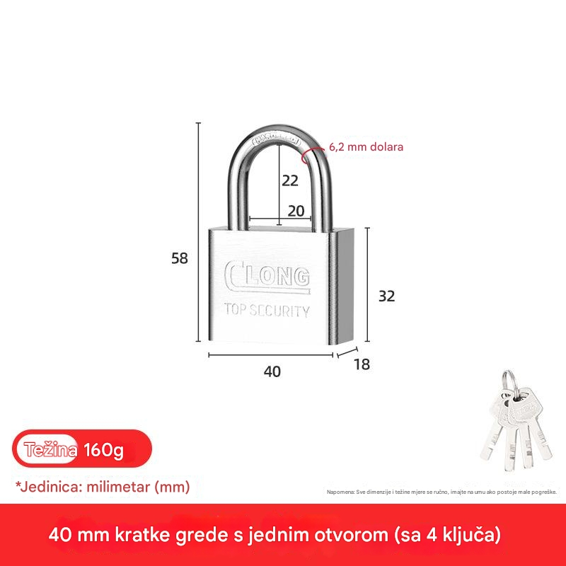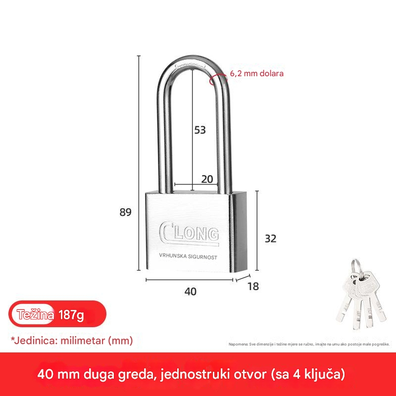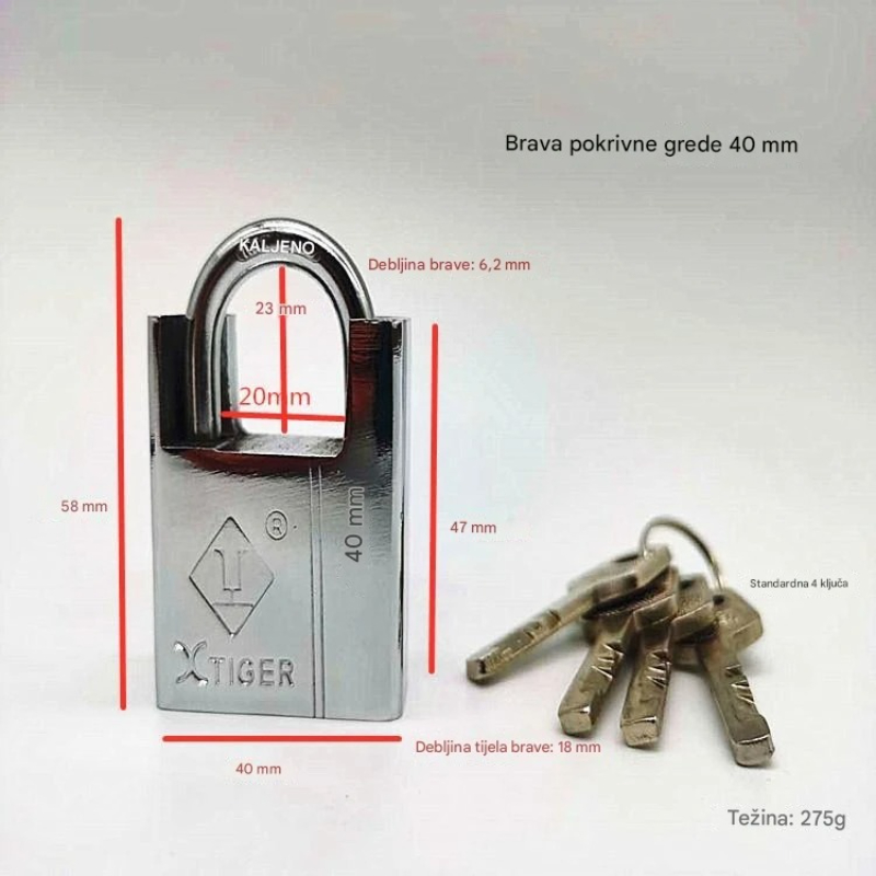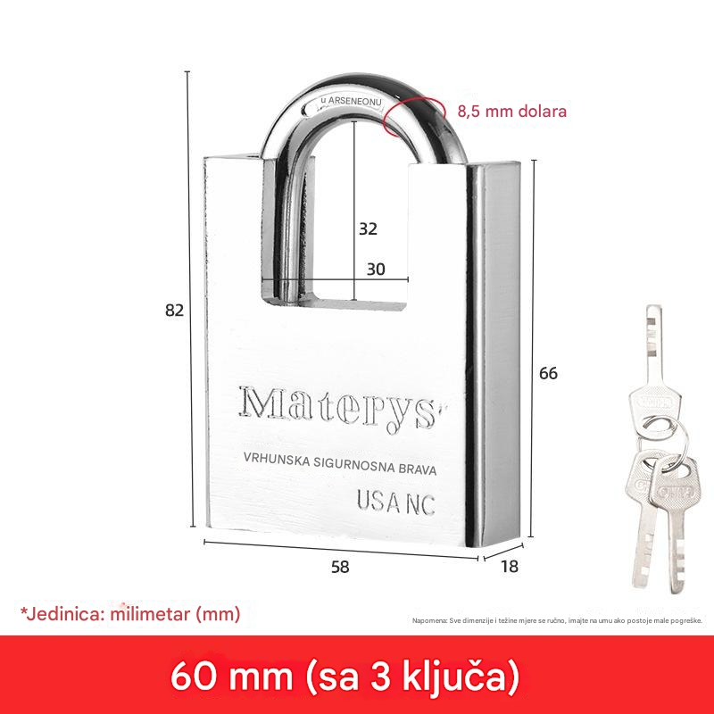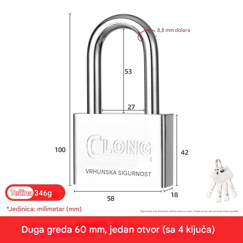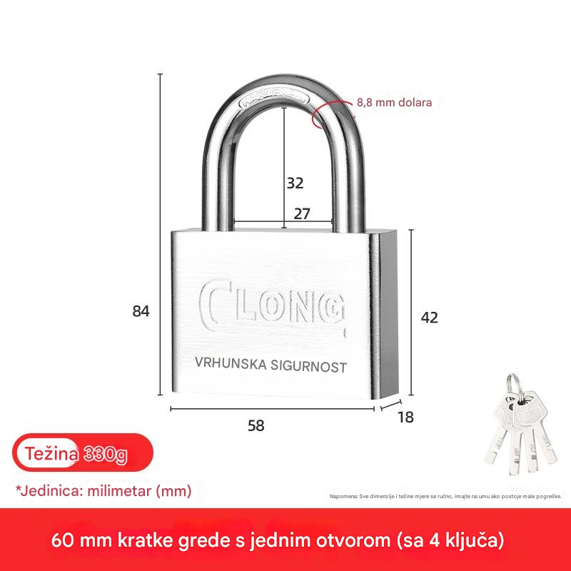 Čelična brava za teške uslove sa 4 kvadratna sečiva i nerđajućom glavom – Brava za vrata, kapije, sefove, škrinje, otporna na neovlašćeno otvaranje, za kancelariju ili poslovne prostore (bez ključa/pristupa)