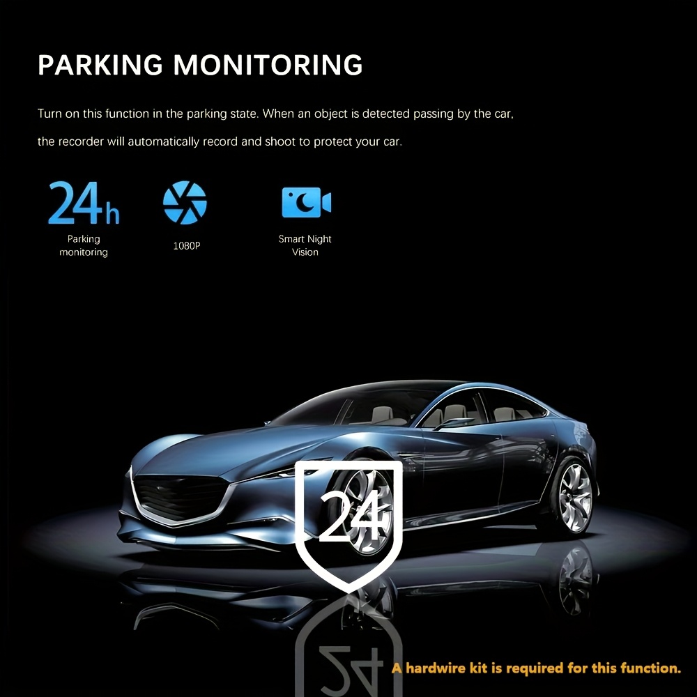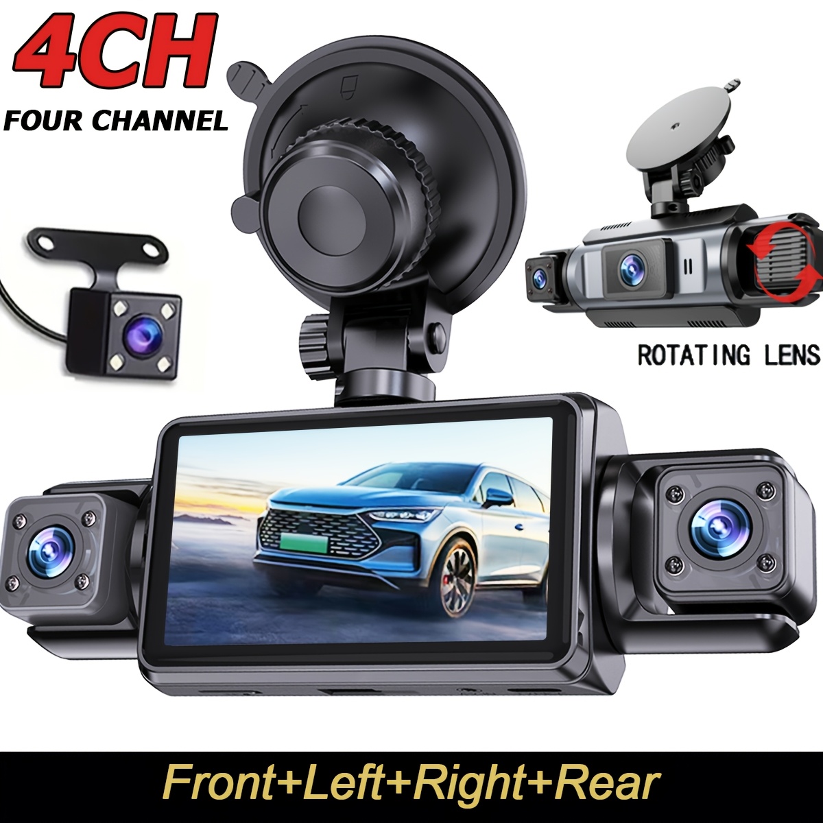 Četvorokanalna kamera za auto, montira se na instrument tablu sa 1080P prednjim i 720P bočnim i zadnjim pogledom – Ima LED ekran, upravljanje na dodir, punjivu litijumsku bateriju, kontinuirani nadzor parkiranja i sistem kamere za rikverc