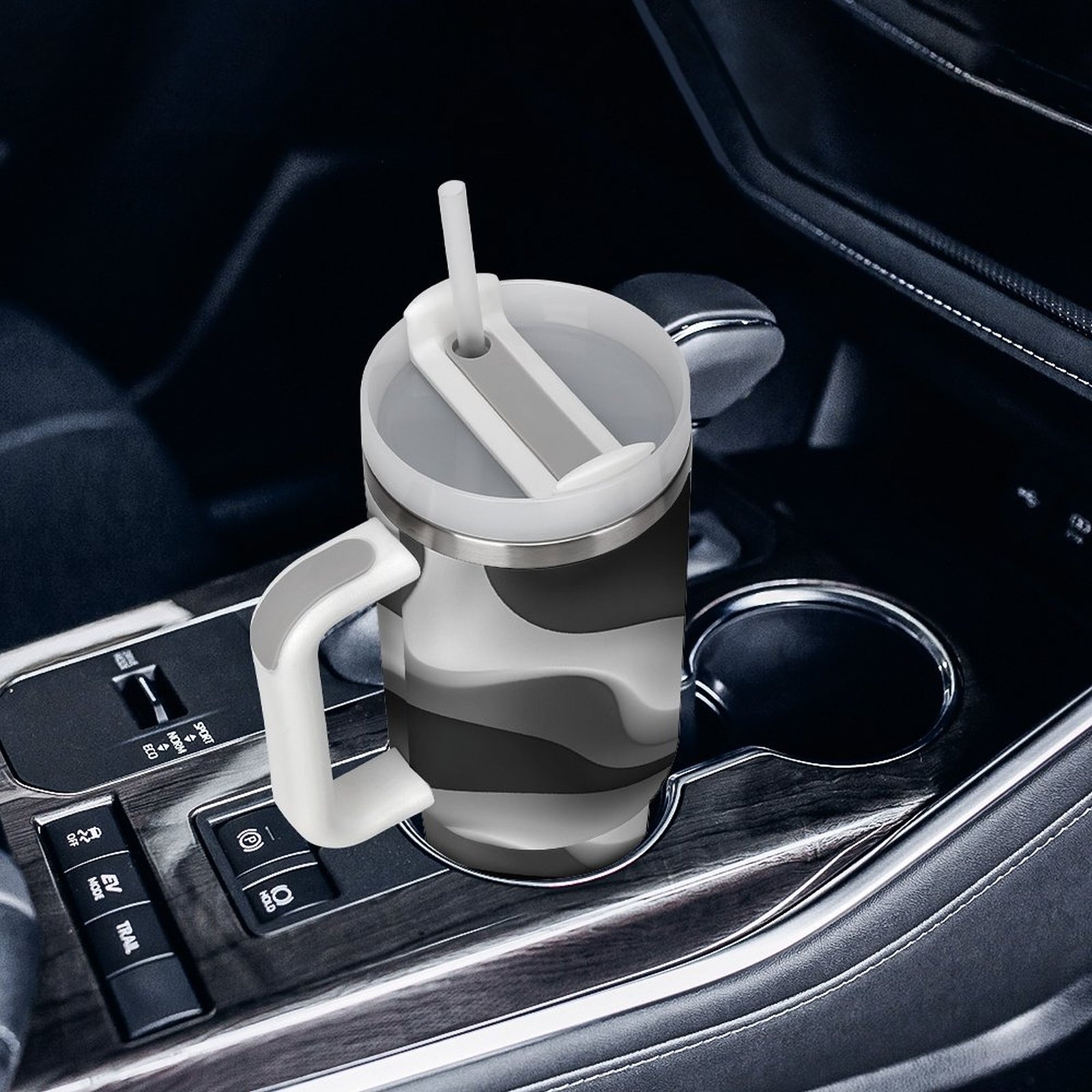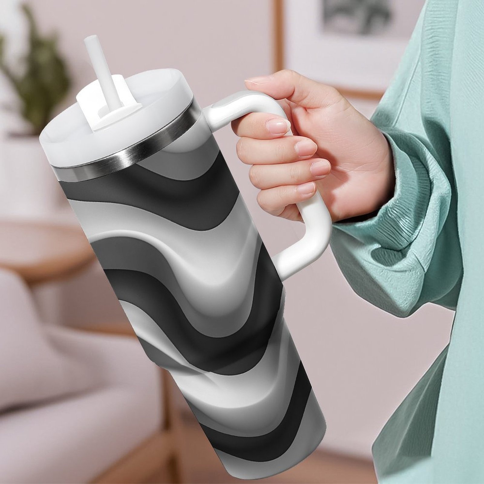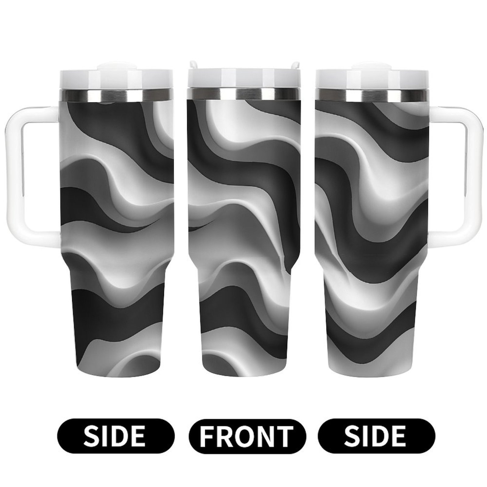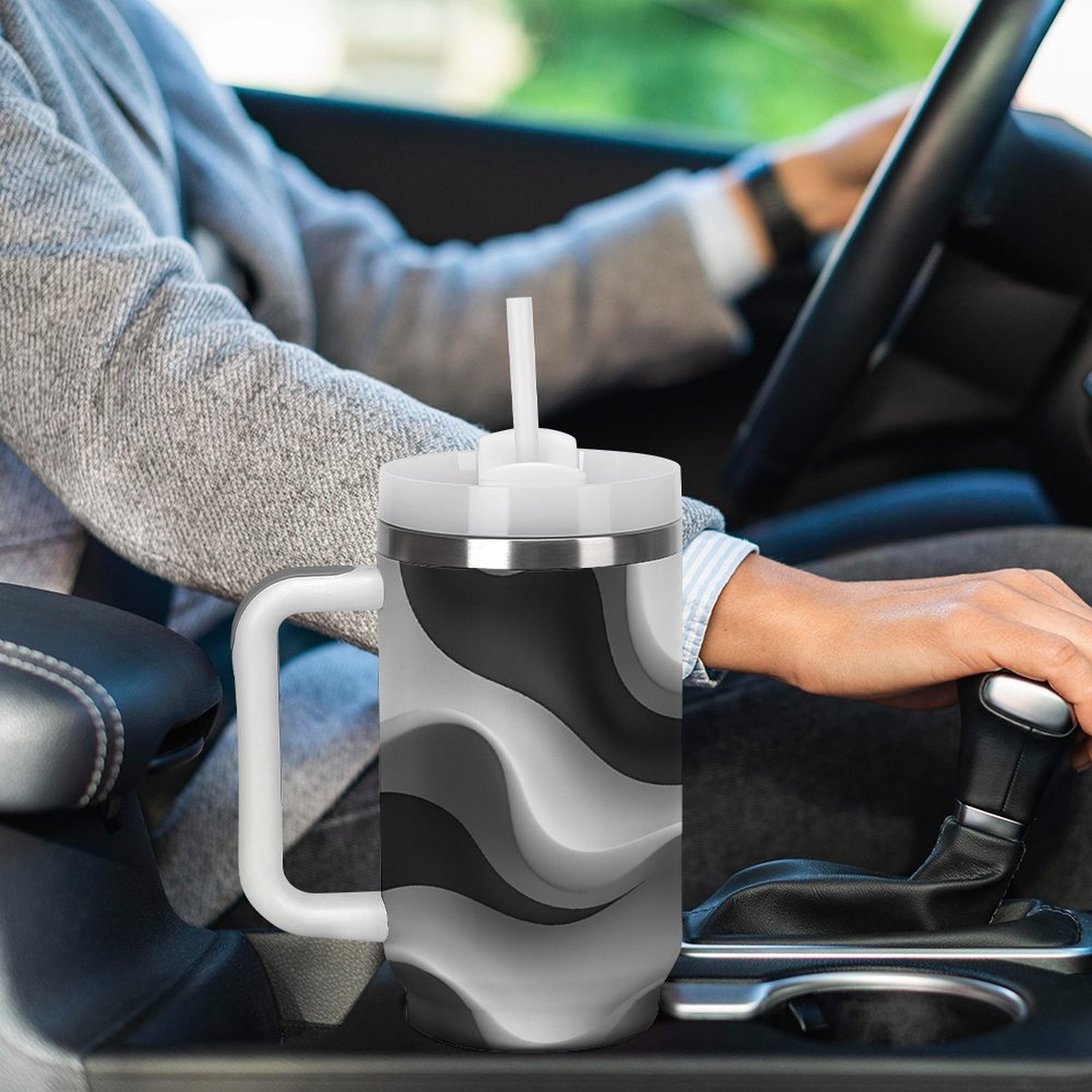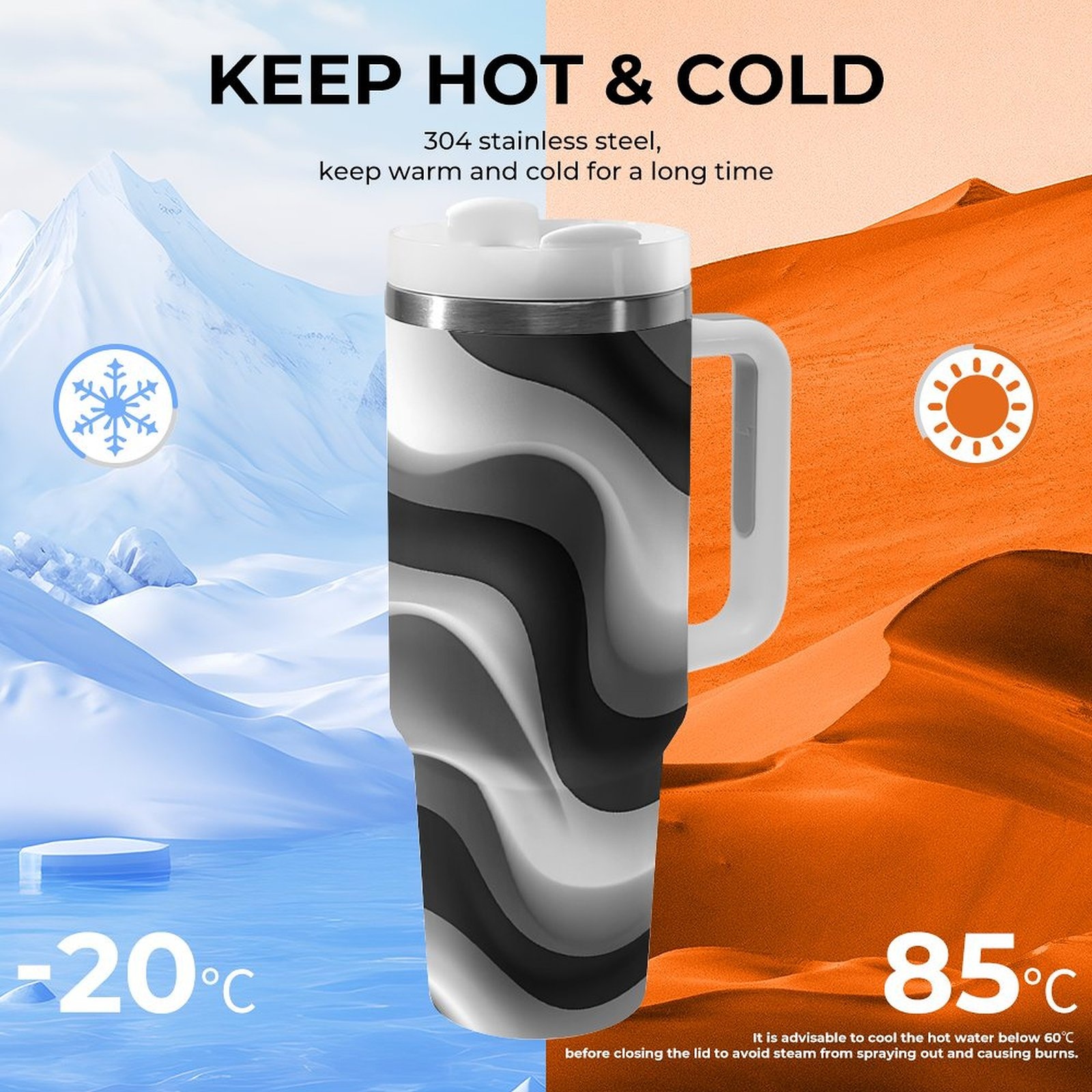 1 kom Velika Termo Čaša od Nerđajućeg Čelika od 40oz sa Slamkom i Ručkom – Dvostruko Zidna Vakuumski Izolovana, Poklopac Protiv Prolijevanja, Crno-Bela Boca za Vodu, Kamuflažni Termo, Veliki Talasni, Termo Šolja, Putna Šolja za Kafu, Veliki Talas, Termo Čaša, Stanly Čaša