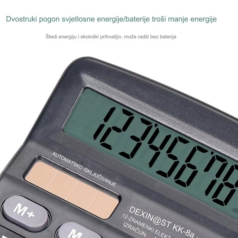 Kalkulator na solarni pogon sa velikim ekranom i dvostrukim izvorom napajanja (solarni i rezervna baterija) – VFD ekran, 12-znamenkasti visoke preciznosti, funkcije memorije, automatsko isključivanje i izračun promene jednim dodirom za finansijsku računovodstvo, kancelariju, školu, inženjering