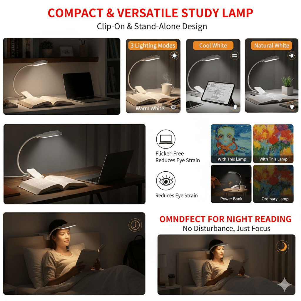 Lampa za čitanje sa punjenjem | Podesiva ruka 360°, zatamnjiva jačina svetlosti, LED mini prenosiva noćna lampa za krevet za kasno čitanje/uspavanje – Idealna za studentske domove, stolove, Božić, Dan zaljubljenih, poklone za povratak u školu