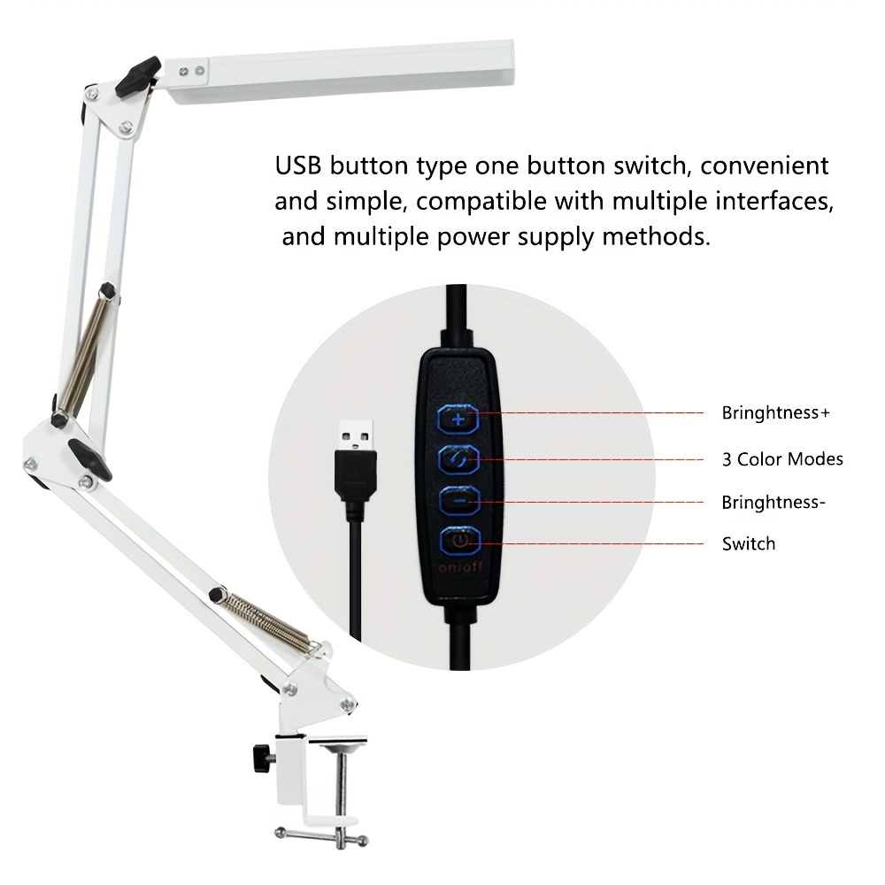 LED stona lampa sa USB napajanjem, dizajnirana za upotrebu u kancelariji, sa zaštitom za oči, podesivom metalnom zakretnom rukom i mogućnostima studija osvetljenja. Nudi tri podešavanja boje i deset nivoa osvetljenosti, što je čini idealnom za čitanje i učenje.