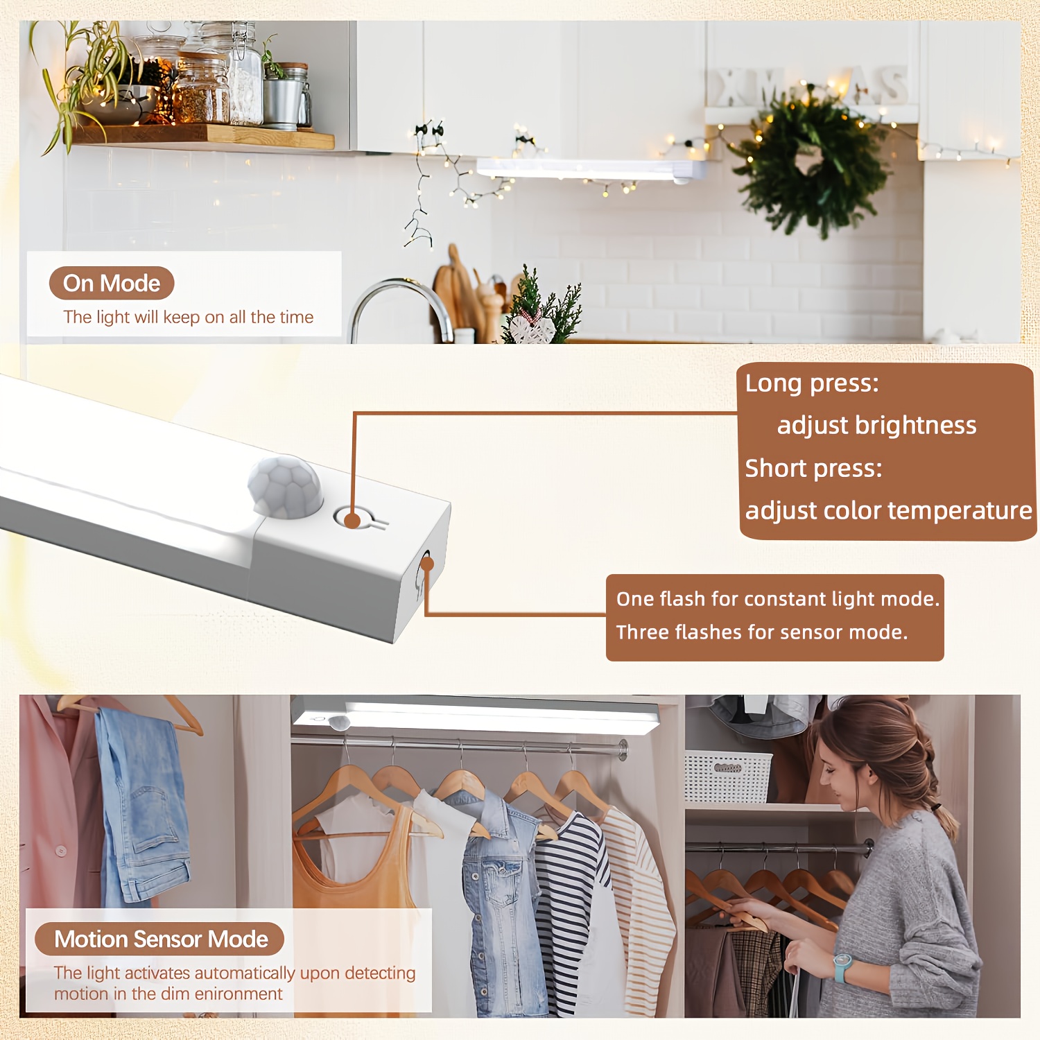 NBBUFF LED svetlo sa senzorom pokreta, tri temperature boje, podesivom osvetljenošću, 360° panoramskim senzorom za ljudsku aktivnost i USB punjenjem. Idealno za upotrebu u spavaćim sobama, pored kreveta, na stepenicama, u ormarima i na stolovima.