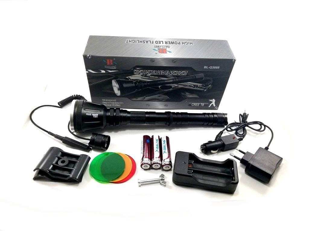 Lovačka lampa Police BL-Q3888 komplet sa pratećom opremom, punjač baterije, auto punjač kao i nosač za pušku.