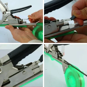 - Laganim pritiskom na ručicu vezačice traka se obavija oko stabiljke, a njeni krajevi se istovremeno režu i spajaju spajalicama.