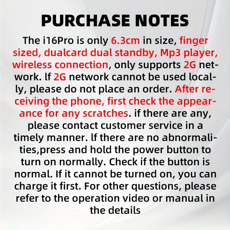 PURCIFU UPOZORENJE za i16 je dimenzija 6.3 cm, kompaktan i prilagođen prstima. Podržava dvostruke SIM kartice i standby, radi MP3 plejer, sa bežičnom povezivošću, ali radi samo na 2G mrežama. Ako niste dostupni u vašem obimu, molimo ne naručujte. Nakon primanja uređaja osetite ga za ogrebotine na površini. Ako vas ne možete pronaći, molite da naručite.