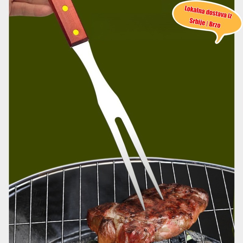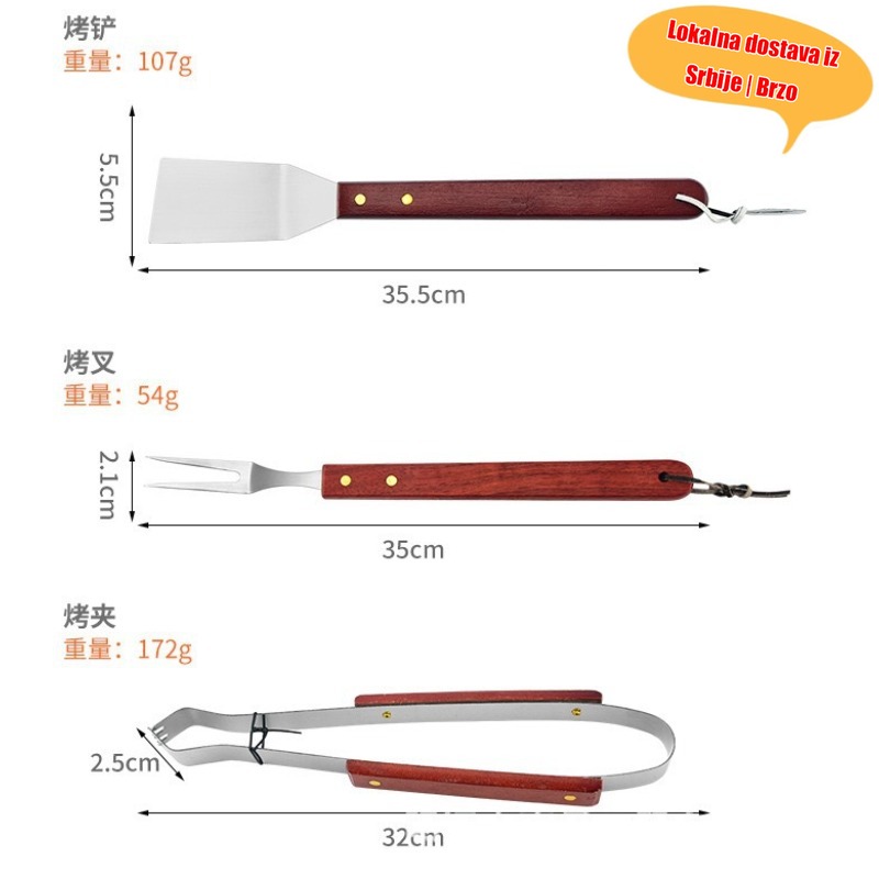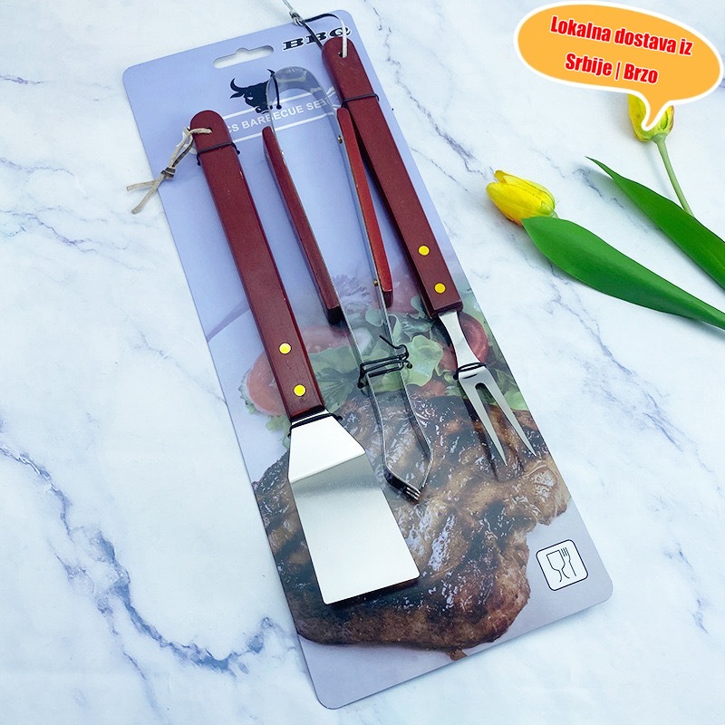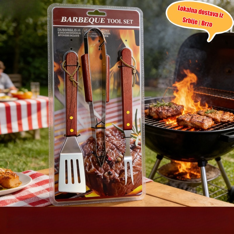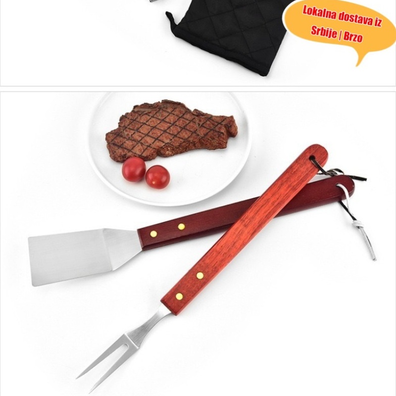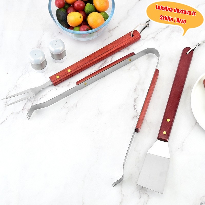 Osnovna oprema za kampovanje za Srbiju! Trodelni set za roštilj od nerđajućeg čelika koji uključuje špatulu, hvataljku i viljušku sve u jednom