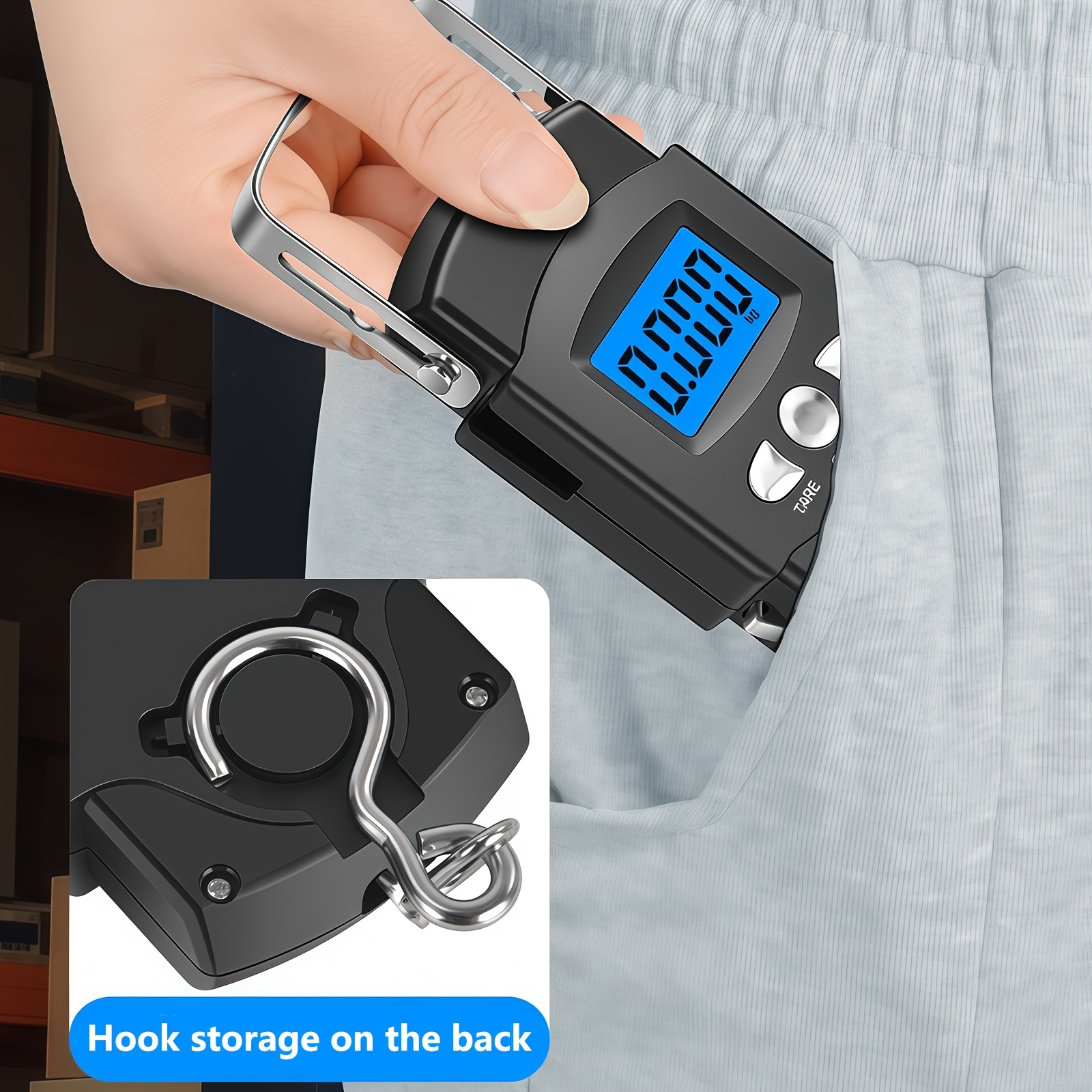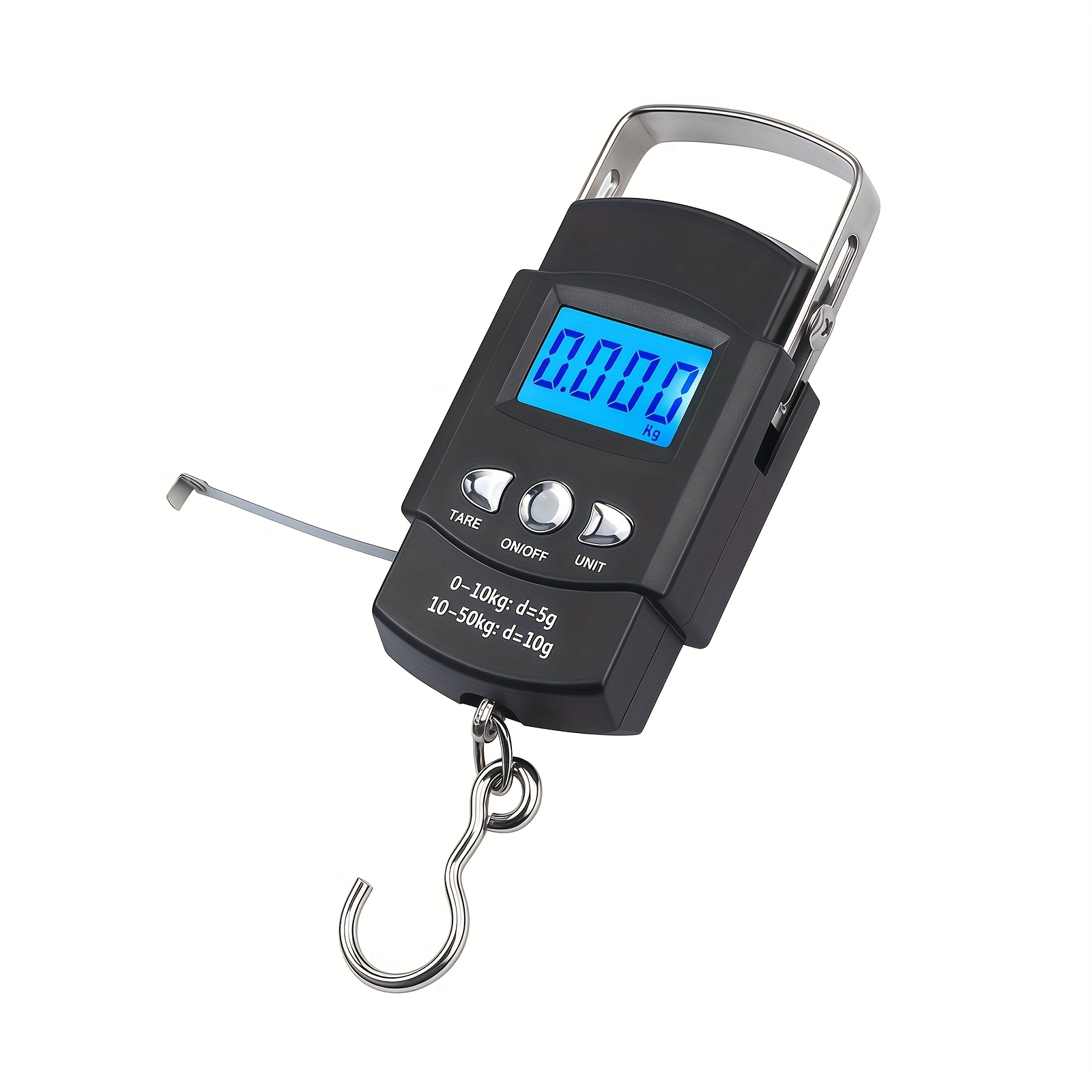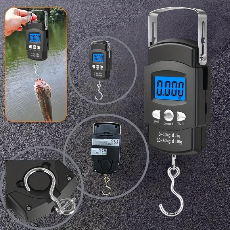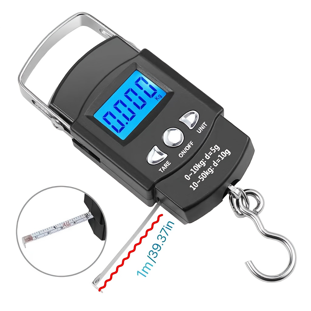 Prenosiva digitalna vaga sa kapacitetom od 110 funti ili 50 kilograma, precizno merenje do 0,1 funte. Uključuje LCD displej sa pozadinskim osvetljenjem, funkciju tare i dolazi sa metrom od 1 metar, idealna za merenje prtljaga, tereta ili riba
