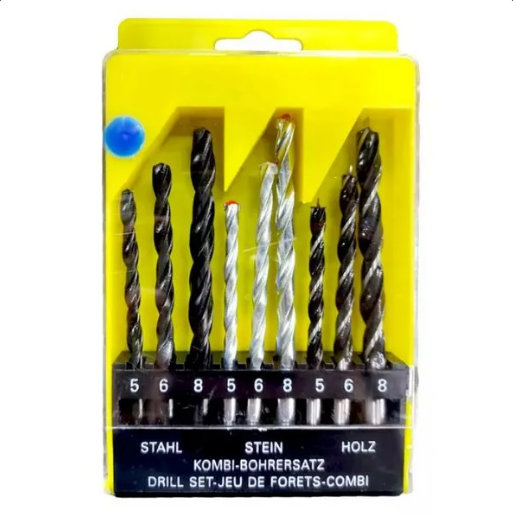 Komplet uključuje burgije najčešćih prečnika 5, 6 i 8 milimetara tri vrste potrebne u različitim situacijama: Za drvo, za metal i za beton