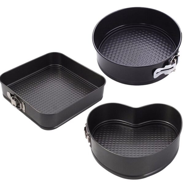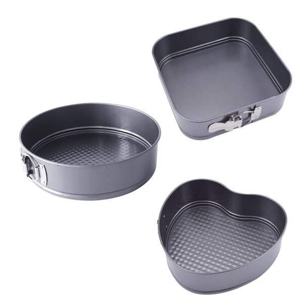 Set od 3 kalupa za torte i kolače, Okrugli (prečnik – 26 cm), četvrtasti (prečnik 28cm) i u obliku srca (prečnik 24cm, visina 7 cm), Obruč koji se skida, Može se peći u njima