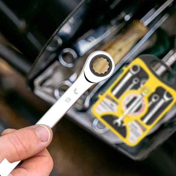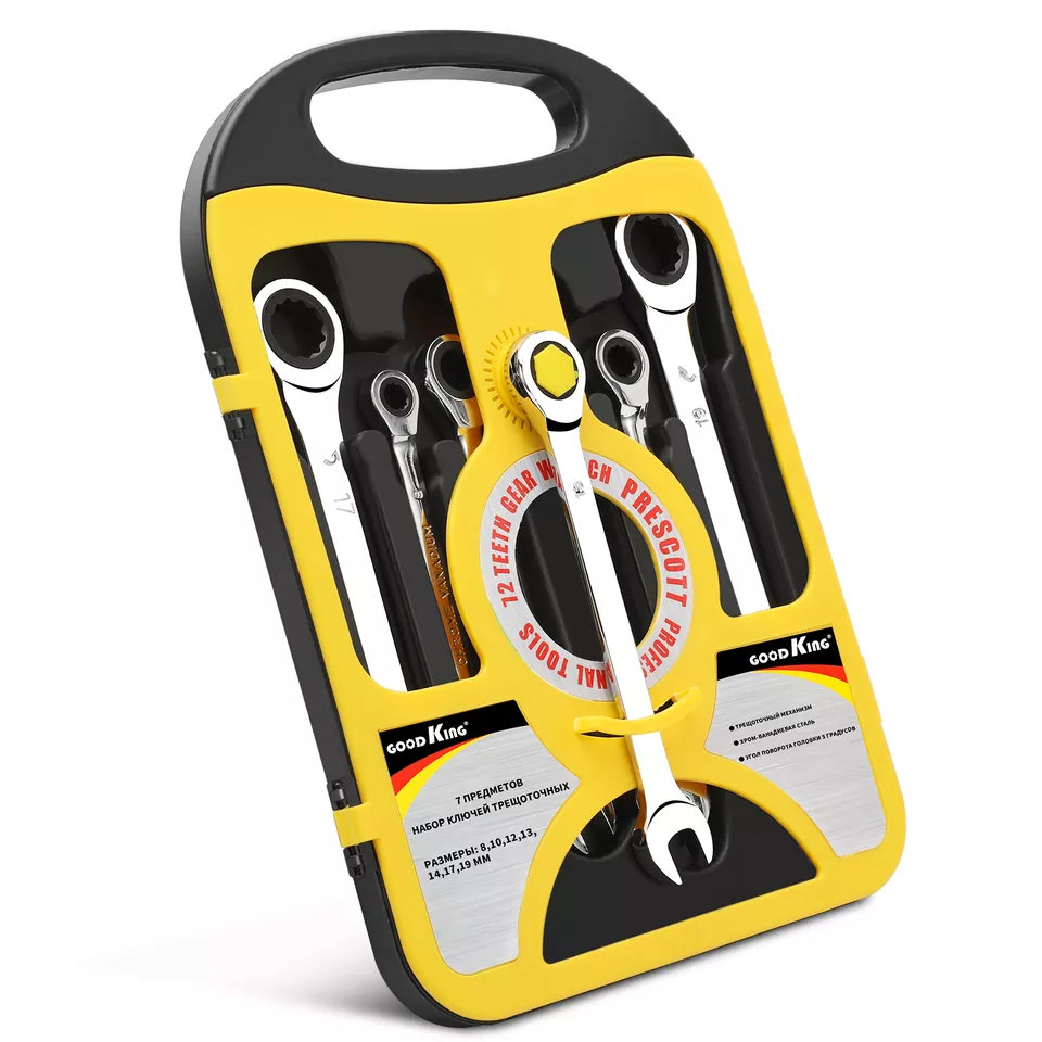 Odličan, kvalitetan set od 7 kombinovanih ključeva., Veličine: 8, 10, 12, 13, 14, 17, 19., Ključevi su viljuškasto-okasti, zglobni, sa račnama., Materijal je hrom-vanadijum čelik.