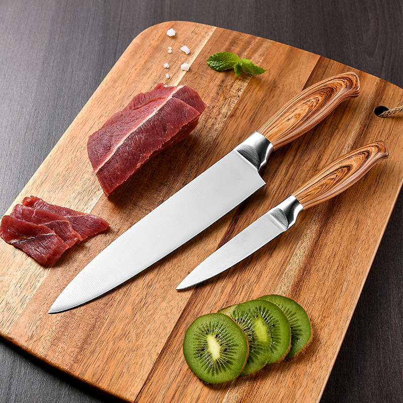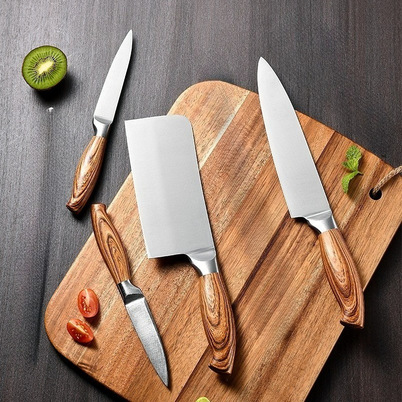 Set kuhinjskih noževa 4 komada, vrhunski oštri | Sečiva od visokougljeničnog nerđajućeg čelika, drvene drške, idealni za sečenje voća i povrća