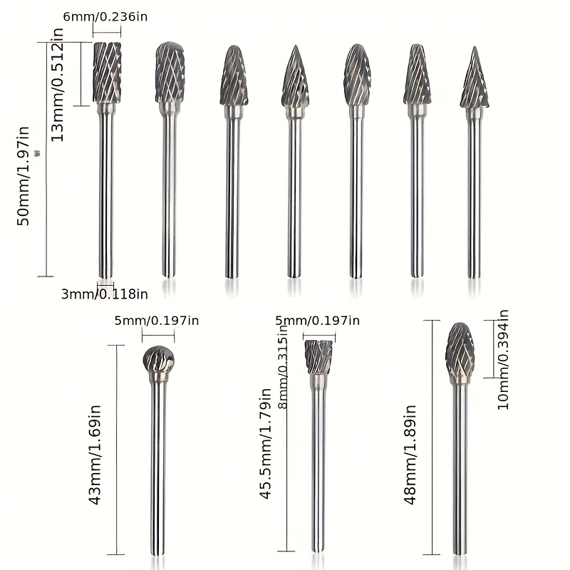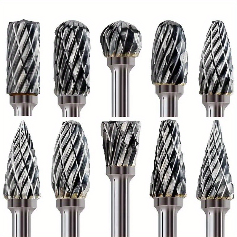Set od 10 glodala od volframove legure sa prihvatom od 3 mm, sa dvostrukim rotacionim sečivima pogodnim za brušenje, poliranje i rezbarenje čelika, drveta, metala, kamena i pločica – Kompatibilno sa električnim bušilicama.
