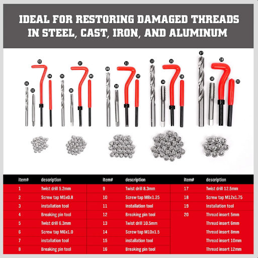 Alat za reparaciju navoja služi za popravku oštećenih navoja radi normalne dalje upotrebe konkretnog dela