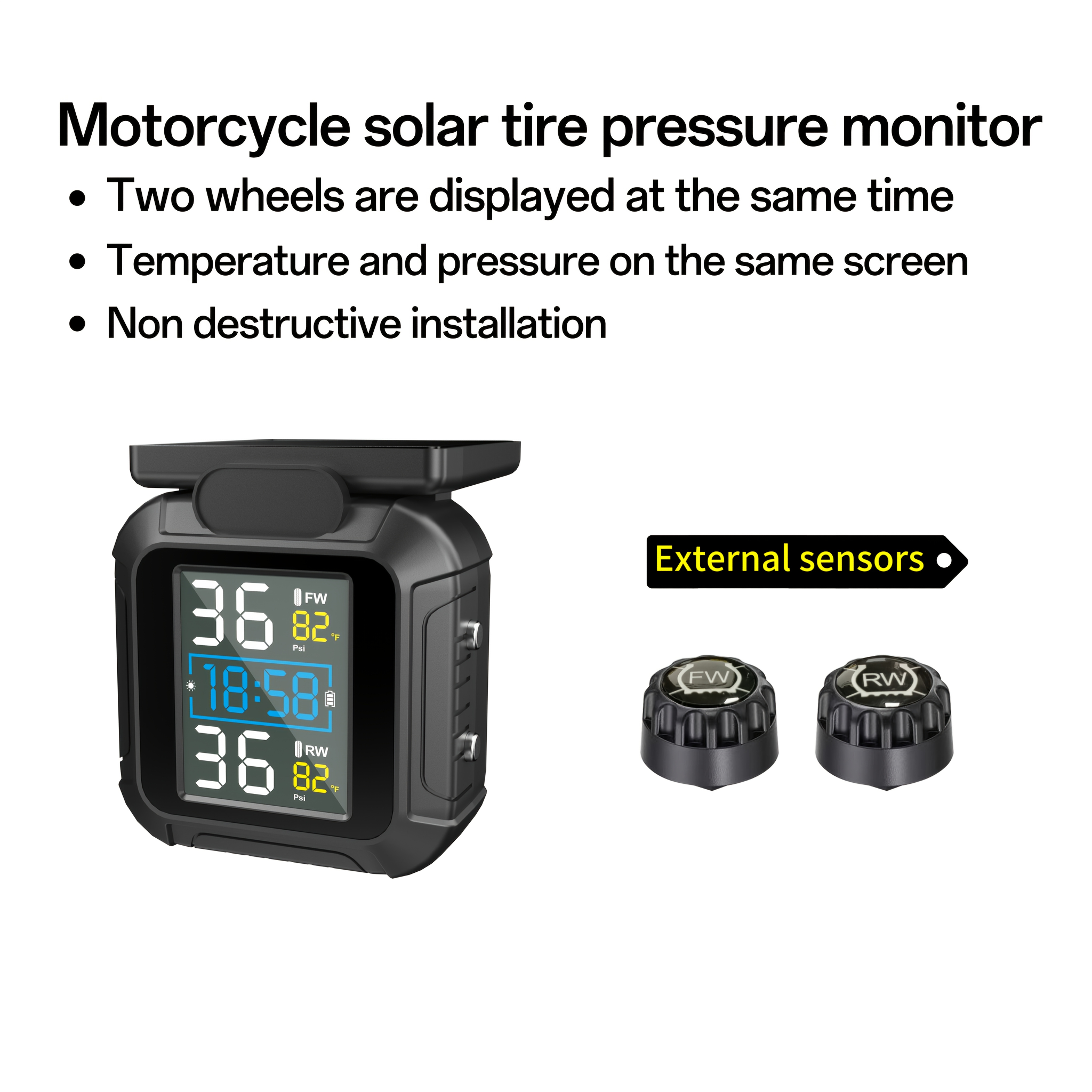 Sistem za praćenje pritiska u gumama motocikla TPMS sa solarnim i magnetnim punjenjem, satom, LCD displejem, 2 spoljna senzora, merilom pritiska u gumama u realnom vremenu