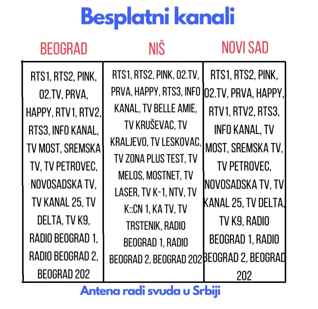 Ovom antenom gledate do 30 kanala svakog meseca,a samo neki od njih su rts1,rts2,pink,prva,happy,b92…