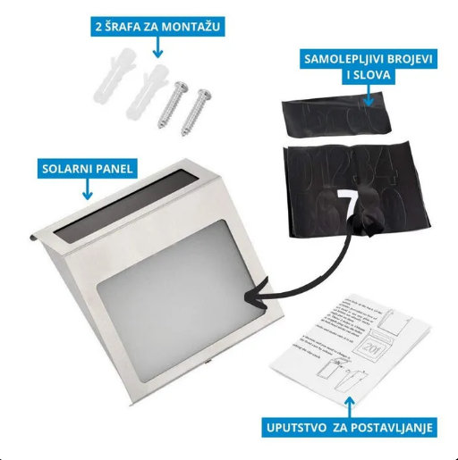 Sadržaj paketa: Svetleći solarni kućni broj, samolepljivi brojevi i slova + šrafovi za postavljanje