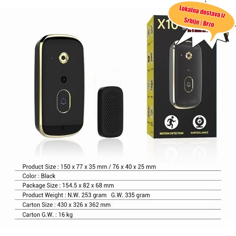 X10 HD Kamera Video Zvono za Vrata – Punjivo preko USB-a, Idealno za Spoljnu Upotrebu, Detekcija Pokreta, Video Pozivi, Bežično, Kućna Sigurnost, Jednostavno za Korišćenje